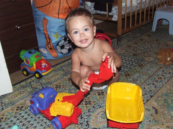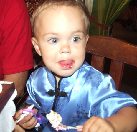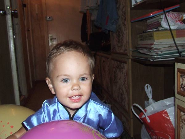 А мы надули много шариков - Федя с утра обалдел :) Потом пришла соседская девочка - часика два вместе поиграли. Вечером ближащие родственники выпили за здоровье именинника и салют небольшой устроили :) Салюта Федя испугался, хоть не плакал, но в меня вцепился насмерть :) Подарили гараж, самолетики разбирающиеся отверткой, ферму игрушечную и барабан :)) Вот именинник :) |