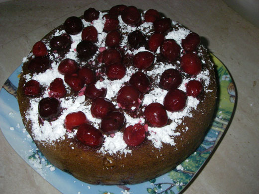 Яйца с сахаром взбить, добавить растительное масло и апельсиновый сок. Подмешать муку, овсяные хлопья, разрыхлитель, порошок какао и корицу. Выложить тесто в мультю, смазанную жиром. Сверху распределить ягоды. Выпекать 1ч.40мин. Остудить, украсить сахарной пудрой и ягодами.