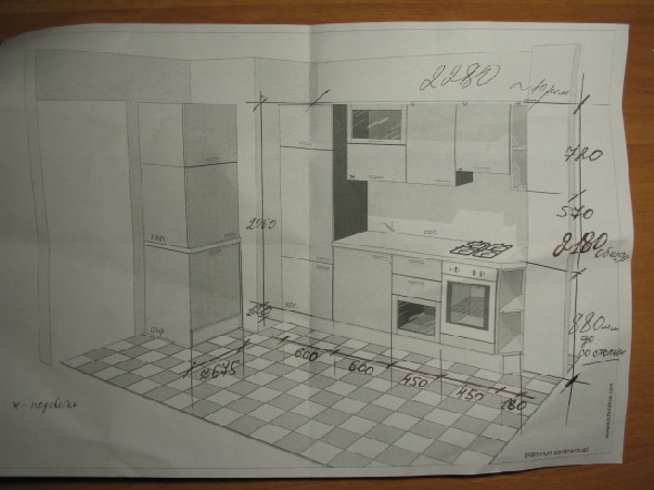 Имеется маленькая кухня, в которую нужно уместить холодильник, ПММ, стиралку и плиту. Под раковиной предполагается фильтр для питьевой воды. Вот плод моего воображения, изображенный дизайнером.