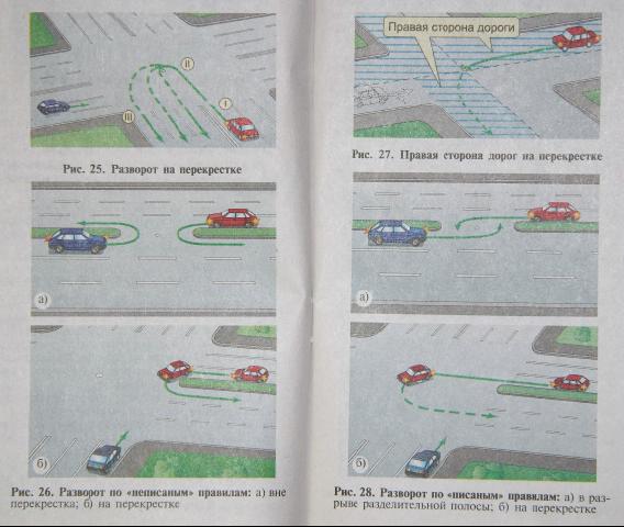 Следовательно, разворот в изображенных на рисунке 26 ситуациях, выполненный по правилам, должен выглядеть совсем по-другому (рис. 28 а и б).