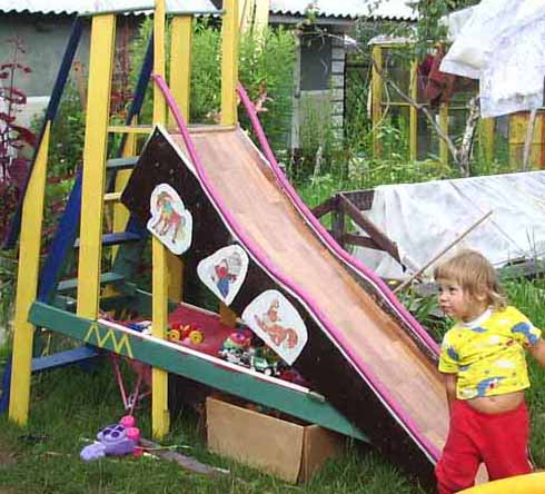 Еще вариант для горки - линолеум, самый дешевый - очень скользкий. Еще листы ПВХ.