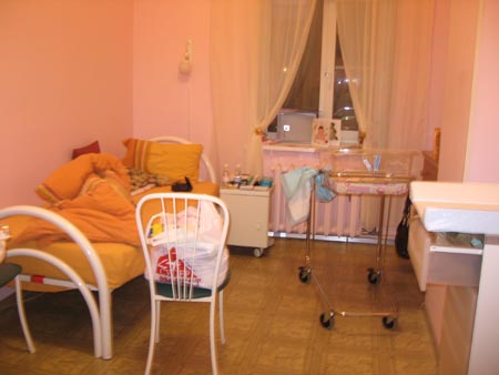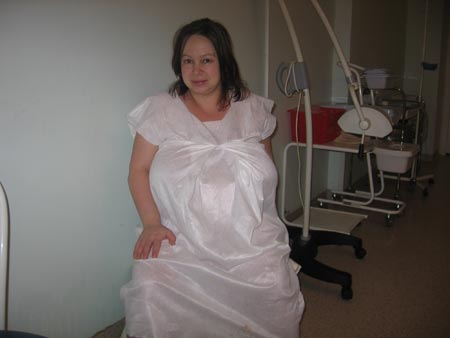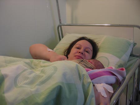 В 7 утра 30-го декабря меня подняли в родилку. Ксана Михайловна извлекла ламинарии (ох и больно же, когда лезут в нераскрывшуюся шейку) и проколола пузырь (совсем не больно, ничего не чувствуешь, только теплая водичка полилась). Ксана Михайловна сказала, что ждем не более 4 часов: если ничего - идем делать КС. Я не возражала, так как важнее всего для меня было родить здорового ребенка, а не добиваться ЕР любой ценой. Да и акушерка, ставившая КТГ, на мои сомнения сказала, что будет правильнее в моем случае КС. Но я еще надеялась, что дело пойдет! Хотя против КС ничего не имела. Первый час совсем почти ничего не было. Приехал мой муж. Постепенно начались схватки. Совершенно бестолковые: интервалы и интенсивность разные - самая длинная схватка была около 30 секунд, а интервалы от 2 до 10 минут - как попало. Живот не каменел вообще, только тянущие боли внизу живота. Я весело позировала для фото, сидя на мячике. Поставили КТГ. Сердечко у малыша бьется нормально, ровно. Схватки где-то до 80-90 (уж не знаю, в каких единицах измеряют их). Я лежу, мне совсем не больно. Но понимаю, что надо делать КС - чего ждать-то? Организм совершенно не собирался рожать! Тем не менее, никто на меня не давил. Решения принимала я сама. Мне внятно объяснили все сложности моего организма и после 10 утра Ксана Михайловна предложила выбор: КС или многочасовые попытки родовозбуждения. Я выбрала КС. Тем более, что передние-то воды были хорошими, а вылившиеся на схватках задние воды - уже с зеленью... Я страшно боялась за малыша и совсем не боялась за себя. Тем более, рядом был муж. Решение принимали мы с ним вместе. Меня посадили на кресло-каталку и перевезли в соседний зал - операционную. Предложили на выбор общую или эпидуральную анестезию. Я выбрала эпидуральную и ни чуть не жалею. Надо сказать пару слов о том, как трепетно и нежно со мной обращались анестезиологи, акушерки, медсестры... Все старались поддержать, объяснить, помочь. Я чувсвствовала себя маленьким ребенком, вокруг которого несколько родных мам! КС под эпидуралкой - удивительное ощущение. Я чувствовала, как трогают мой живот, но не чувствовала боли. Это похоже на то, как трогаешь онемевшую во сне руку. У моей головы все время стояла анестезиолог и поддерживала меня. Мы с ней о чем-то переговаривались, но вдруг... Кто-то мяукнул!!! Тихо-тихо так... Ксана Михайловна сказала: "Одиннадцать часов семь минут." И вот мне к лицу поднесли такое маленькое, еще синюшное, с пуповиной существо с большими умными внимательными глазами!!! Я заплакала! Акушерка раздвинула ему ножки, предъявила мужское достоинство и очень быстро унесла в родилку, где ждал муж и где проводилась первая обработка малыша. Дальше был ряд неприятных моментов: когда стали зашивать и матка стала сокращаться, у меня началась истерика, так как показалось, что онемели легкие и мне не вдохнуть воздух. Анестезиолог успокаивала меня как могла, держала маску, чтобы я дышала кислородом, объясняла мне все, что со мной в этот момент делают. В итоге я расплакалась, у меня заложило нос (тут же закапали и все прошло). И вот я услышала, как кто-то вошел в операционную: акушерка принесла пупсика в клетчатой пеленке. Пупсик смотрел на меня умными миндалевидными глазами, а мои руки, как на зло, были закреплены по бокам от стола и утыканы капельницами!!! Акушерка взяла мою грудь, выдавила молозиво и дала ма