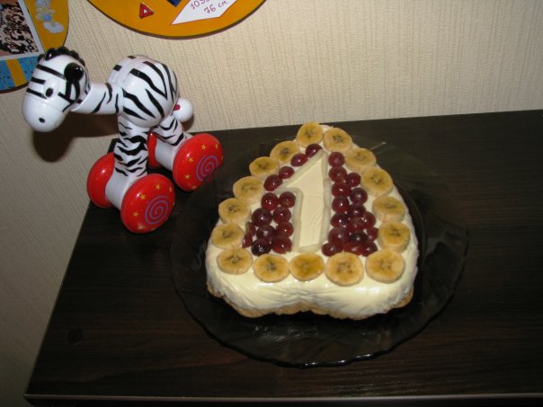Я делала тортик из творога самодельного и печенья детского. Украшала виноградом и бананом