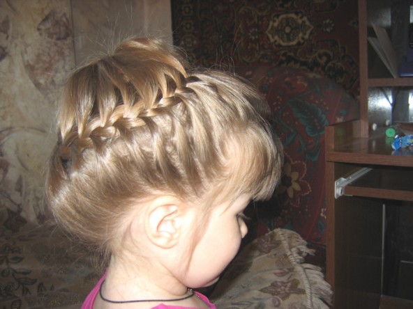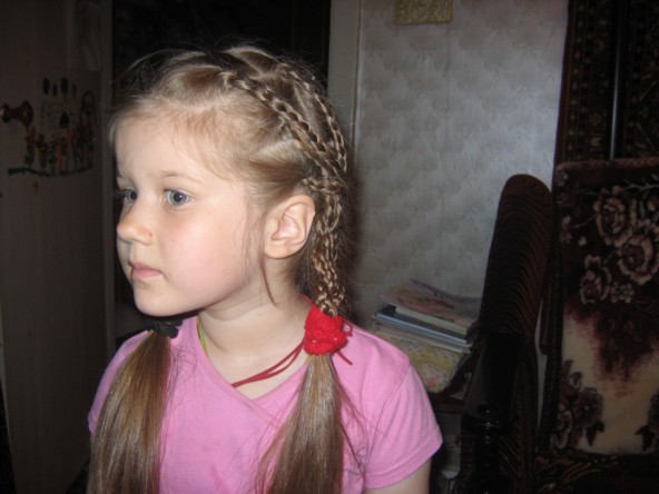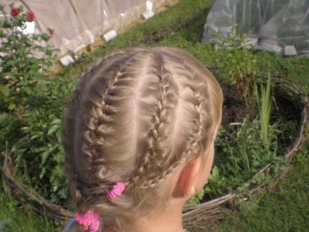 вот еще одна прическа - заплетаю несколько косичек с каждой стороны,а потом их на две разбиваю и плеты косы уже маленьких косичек...