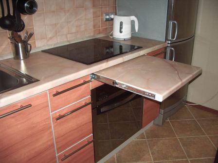между встроенной варочной поверхностью и встроенной духовкой сделана выдвижная столешница на случай бурной готовки. правда, посудомоечная машина, конечно, не поместится - это минус. всем остальным я была очень даже довольна (кухню оставили при продаже квартиры, поэтому прошеднее время)