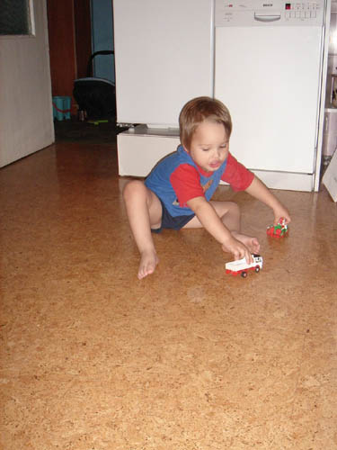 Клеевую пробку мы выбирали исходя из той логики, что она будет лежат на кухне, где всегда возможен пролив воды на пол. Причем мы точно знали, что такие проливы у нас будут происходить регулярно. Во первых деть постоянно проливает кружку с чаем на пол, а во вторых у нас есть чудесная стиральная машина фирмы СамСунь - реальный подарок для врага. Периодически она любит выливать на пол литров по 10 воды с порошком. Причем она не ломаная, она с рождения такая. Это просто ее конструктивный дефект - сливное отверстие, куда сливается вода с порошком из бункера очень маленькое, и стоит туда попасть небольшому комку порошка, как оно забивается и вода течет из машины на пол.