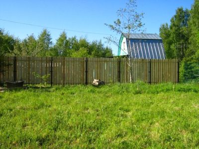 Отгородились от соседей вот таким забором - доска обрезная, а к лесу - рабица.