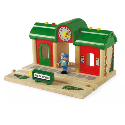 Вот, например, описание станции: Железнодорожная станция работает как настоящая: звучат объявления, раздаются гудки паровоза, светится прожектор на крыше станции, работает билетная касса, имеется вывеска с названием станции. Для записи необходимо нажать на красную кнопку и произнеси любые названия станций. Теперь, всякий раз при нажатии желтой кнопки, будут звучать записанные названия. |