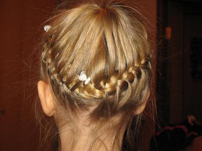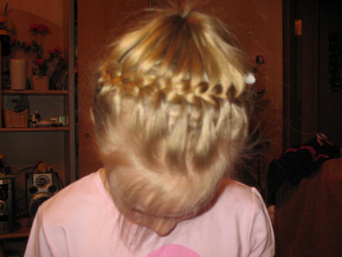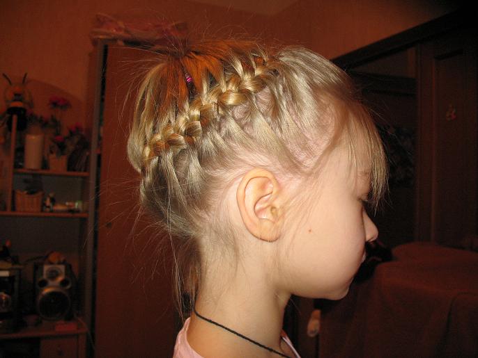 ОЧЕНЬ ХОРОШО ПОЛУЧИЛОСЬмне только кажется, что плести надо потуже и поплотнее немного... Нам тоже очень нравится эта причёска, я ещё делаю такой вариант - на хвост одеваем красивую резинку, с большим цветком например и начинаю плести не сзади по кругу, а спереди в одну сторону и в другую - сзади получается не одна косичка, а две, которые убираю вовнутрь - мне кажется такой варант тоже очень интересен... я уже выкладывала эту фотку, но тут к месту покажу её ещё раз ![]() |