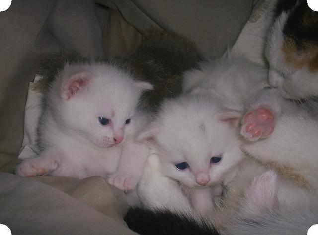 Погодка - супер, бабочки летают, мать-и-мачеха цветёт..... Юля, а у меня у самой мандраж: ОСТАЛОСЬ 4 дня до открытия 18 роддома....а я второй день встаю не свет ни заря, а потом в 9 утра ложусь и дрыхну до 12.... А вечером...рок-н-рол в животе...Вчера муж мой испужался моего вида, хотел скорую вызвать...но я ему не дала, говорю : РАНО ЕЩЁ!!!! Но у меня жуткая изжога что ли разыгралась...воздуху мен было мало. А по поводу кота-красавца - ещё раз напоминаю всем желающим: у кошки маминой снова скоро будут котята.... Есть возможность взять белоснежного красавца с шикарным хвостом ( у Муськи почему то все дети одинаковые получаюца, как под копирочку). Муська вроде тоже уже того....апрелюшка-беременюшка. Котищщи у нас обычно вот такие: |