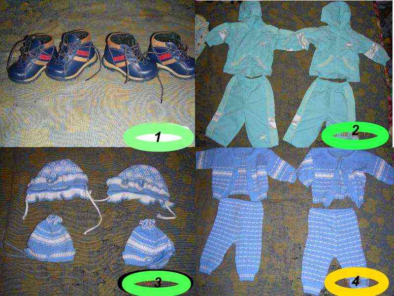 1-ботиночки 21 р-ра 2 пары за 350 рублей 2-бирюзовые костюмчики от 6 месяцев-2 шт за 400 рублей 3-две шапочки за 150 рублей 4-два костюмчика шерстяных -300 рублей |