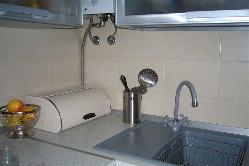 Это сейчас. В уголок много чего поставить можно, я хлебницу подобрала. Кран поменяли старый и решетку в раковину купила. Да, и табуреточки прикупила.