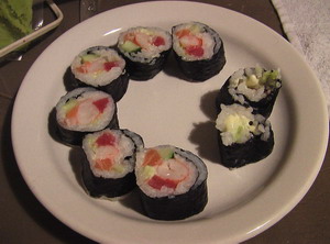 ) но теперь я ближе к совершенству на 1 шаг, поскольку знаю где прокололась! Еще делала суши с острым лососем, спайси соус был придуман из майонеза и перца чили - получилось совсем не то что нужно, майонез для этих целей слишком жирный. Надо думать над рецептом спайси-соуса. А еще сегодня в Карусели видела филе тунца - но брать не рискнула, оно было какого сине-красного цвета, как мясо залежавшеесся, неаппетитно совсем! |