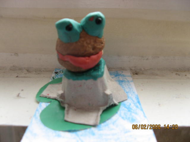 лягушка- грецкий орех, кочка- от упаковки яиц штука. ну и пластилин.