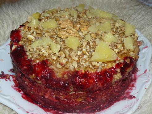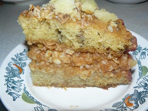 Поэтому просто протертые яблоки с ванильным сахаром и орехами, и два коржа бисквитных, верхний- с орехами грецкими. Сверху-орехи и ананасы. Вкусный и не сухой! Я все коржи пропитала ананасовым сиропом, так что они получились сочные. Ну и печёная картошечка. |