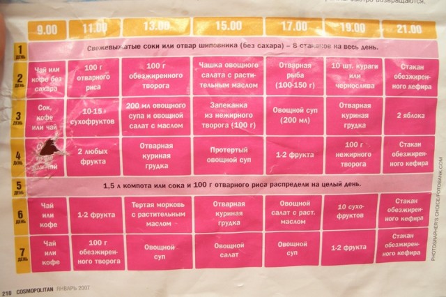 вижу, с понедельника народ опять кучкуется... предложу свой очередной вариант , на который я сажусь с понедельника:Восточная сытная диета Данная диета действительно довольно сытная – калорийность дневного рациона достигает 1700 ккал. Поэтому худеть вы будете не столь стремительно, как на других полуголодных диетах, зато и голодать не придется. Кроме того, слишком сильное ограничение пищи может отрицательно сказаться на здоровье и замедлить обмен веществ. Диета довольно сбалансирована, включает много свежих овощей и фруктов, растительные и животные белки. Основным источником углеводов является рис – питательная и полезная крупа. Хлеб предпочтительнее выбирать из муки грубого помола. Все семь дней диеты необходимо избегать алкогольных напитков. Первый деньЗавтрак: 150 г свежей белокочанной капусты, стакан минеральной воды. Обед: 4 ст. л. варёного риса, 150 г салата из тёртой свежей моркови с оливковым маслом, стакан минеральной воды. Ужин: 150 г отварной рыбы, небольшой кусок хлеба, листовой салат. Второй деньЗавтрак: рисовая каша на молоке, стакан яблочного сока. Обед: 200 г отварной рыбы, салат из яблок, груш, апельсинов, стакан персикового или апельсинового сока. Ужин: 200 г нежирного жареного мяса, небольшой кусочек хлеба, 4 листочка салата с лимонным соком, апельсин. Третий деньЗавтрак: 200 г салата из свежих яблок, груш, апельсинов, бананов, стакан апельсинового сока. Обед: 250 г варёной фасоли, 150 г салата из капусты с лимонным соком, кусочек хлеба, стакан минеральной воды. Ужин: 250 г жареных грибов, 1 небольшая картофелина, стакан минеральной воды. Четвёртый деньЗавтрак: стакан яблочного сока, яблоко и апельсин. Обед: 200 вареной цветной капусты с рисом, большое яблоко, небольшой ломтик хлеба, стакан минеральной воды. Ужин: 2 варёных картофелины, 200 г отварной рыбы, небольшой кусочек хлеба. Пятый деньЗавтрак: рисовая каша на молоке, стакан минеральной воды. Обед: 200 г салата из белокочанной и морской капусты, небольшой кусочек хлеба, стакан минеральной воды. Ужин: 200 г салата из капусты, моркови и зелёного салата с растительным маслом, 1 лепёшка из рисовой муки, стакан минеральной воды. Шестой деньЗавтрак: 150 г тертой моркови с растительным маслом, кусок хлеба, стакан минеральной воды. Обед: 200 г салата из свежих овощей (капуста, морковь, листья салата, сельдерей), небольшой кусочек хлеба, стакан яблочного сока. Ужин: 100 г варёного риса, листовой салат, половина грейпфрута, стакан минеральной воды. Седьмой деньЗавтрак: 250 г фруктового салата (яблоки, чернослив, абрикосы), стакан минеральной воды. Обед: 150 г риса с кусочками фруктов и 1 ст. л. мёда, стакан минеральной воды. Ужин: 150 г отварной рыбы, 200 г салата из морской капусты, кусочек хлеба, стакан минеральной воды. |