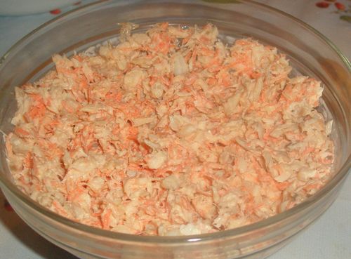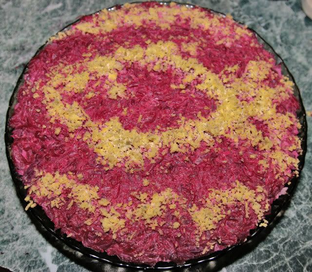 Рыбка под шубой. Рыбка - потому что не селедка, а малосольная кета (сама солила, а рыбка из закупочки!). Рисунок, правда, корявенький, потому что лень было делать трафарет, и кушать очень хотелось, посыпала на глазок.