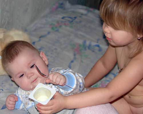 Прихожу через 10 минут,Ксюха дала Ане ложку,и та с удовльствием трескает