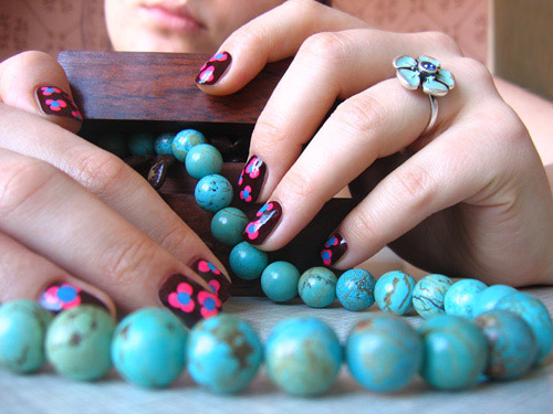 Просто поставила лаком, пока не засох бордовый лак-основа, три точки розовым и одну - бирюзовым, получается цветочек. И потом сверху пройтись прозрачным лаком-закрепителем.