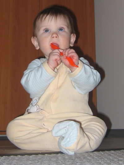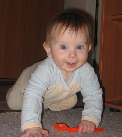 мы стали совсем большие и самостоятельные. И хотя рост наш почти не изменился с прошлого месяца - 71 см (+1 см), зато вес увеличился на 600 гр (8760) и вширь мы стали больше на 1,5 см в окружности! а зубов у нас 8!!! есть надежда, что теперь мы будем спать спокойно до тех пор, пока следующие зубы не начнут лезть.... (мечты-мечты)из новых умений стоит отметить стремительное ползание по всей квартире с вставанием и залезанием во все места, куда нас не просят Кушаем мы все, что дадут: сыр, печенье, котлетки, мяско, картошечку, бананы, яблоки, груши, виноград, творожок ну и кашки-кашки-кашки... очень мы их любим... маму есть почти перестали, ну так, иногда... из любви к искусству... А еще папа подарил нам машину-каталку и мы учимся на ней ездить... пока не очень, но мы стараемся. ну и пара фоток... вот такие мы жанихи.... ау....невесты..... |