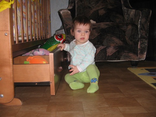 А мы решили начинать спать в кроватке. И первым шагом к этому было снова переселение кроватки из детской в нашу комнату. Кровать мы переселели, а в ящик под нее сложили все игрушки Машины. И вот сегодня Машуня занялась исследованием своего богатства
