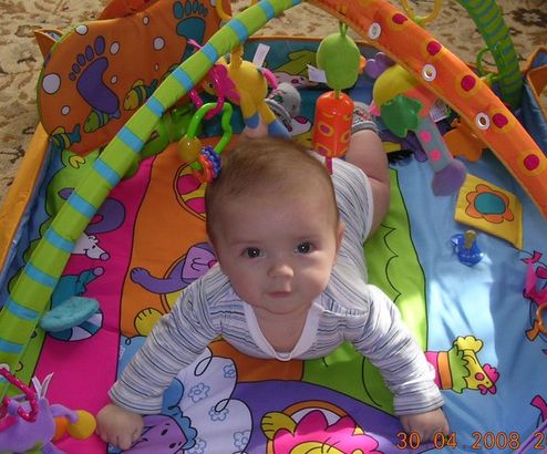 Вы так головку хорошо держите и поднимаетесь, у вас с тонусом все впорядке? А тыо мы так держим, правда иногда еще выше задрать пытаемся и нам тонус поставили. Правда мы еще ножки и ручки сильно сжимаем. Очень сильно. Вы что телек смотрите? Я запрещаю мужу перд телеком сидеть. А Дашка все норовит туда нырнуть. |