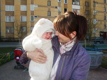 в люльке моя так плохо спит... уже далеко и не уйти - вчера брала с собой кенгуруху на прогуляку. Час в люльке, 45 минут в кенгуру (бедная моя спина!!), потом снова в люльке еще час и до дома минут 15-20 шли. 3 часа - но погуляли! хоть 3 раза по часу выходи! так ее одевать дольше! |