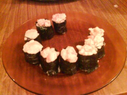 ![]() темпура и ролл-делал любимые) а вот те совсем кривенькие(врожденная криворукость))))-мои жалкие попытки сделать спайси..так и не поняла как их нормально делать) |