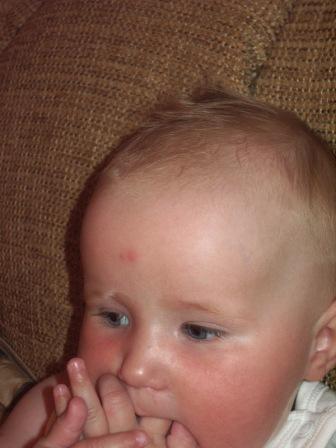 На лбу прыщик - это нас на даче покусали комары. Вкусные мы!