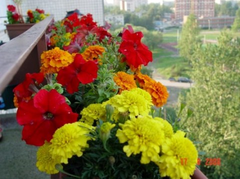 Я в этом году сажала только петуньки и бархатцы.Теперь вижу,что не хватает синей гаммы...Эх,лобелии бы ![]() |