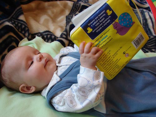 Детка, впрочем, бодра, весела, всеми конечностями активно дрыгает, переворачивается, в общем, ведёт себя, как обычно.
