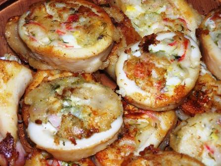 ![]() Точно не помню рецепт,что то не найти. Вообще тушки почистить, немного отварить и начинить фаршем,потом обжарить в панировке или кляре. Но я видоизменила,потому как тушки у меня были огромные и сделав целыми их никто не ел,я порезала кружочками и пожарила в кляре так удобнее. Фарш: немножко риса, крабовые палочки, яйца,кукурузка, майонез,зелень и вроде еще огурчик свежий в общем,начинку можно было отдельно как салат трескать вот такие они были целые нафаршированные |