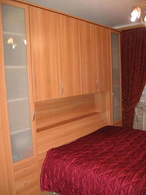 Мне тоже спальня понравилась. Компактно - много шкафов для одежды. Все легко убрать. А удобно смотреть телевизор когда так высоко висит?
