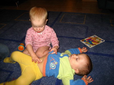 поэтому буду дедовским методом Всем привет! нас тоже накрыла аллергия да так, что Степа спать не мог несколько ночей, все чесался, меня от себя не отпускал ни на минуту, если не грудь мутузить, то хоть рядышком лежать, обнимать и все такое да еще была очередная волна зубов но тока их так и нет новых в общем, никакой возможности писАть нету, тк днем стоит сесть за комп, этот маленький вредитель тут же его выключает еще у моего сыночка "новый этап" (копирайт МашиП) он теперь таскает всюду табуретку, скамеечку и влезает куда повыше со всеми вытекающими отсюда последствиями короче, мать на грани вымирания вчерась ездили к Даше с Аришкой гуляли в Удельном парке. потом пили чай Степа с Аришкой "зажгли не по-деццки" мы уже собирались уходить... Степа надел колГХоты, теплую кофтень.... но вдруг решил поваляться на мягких Дашиных коврах... так Аришка воспользовалась моментом хорошо бдительная мать успела на парня колготки натянуть у меня фоток вакханалии нет но Даша вроде успела заснять |