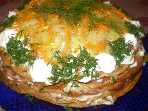 Угощайтесь тортик блинный с тремя начинками. Блины из гречневой муки, а начинки: первая - морковно-луковая с зеленью, вторая- рыбная (консерва) и третья-вареное яйцо и свежий огурец, все слои промазаны майонезом.