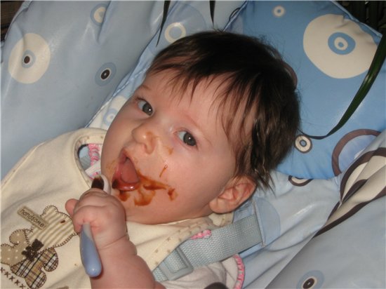 ![]() А вот наш первый прикорм,не удержалась и ввела,првда в силу наших особенностей кишечника ашей первой едой оказался чернослив.А так как мама у нас ленивая,то и есть пришлось самой . |
