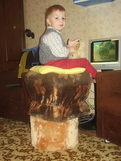 :основание пирамидки-кошачий домик,верх пуфик,так еще и кошкину подушку из домика постелил под попку ,сказав "Чтоб магонько было"... и сидит себе довольный мультики смотрит... |