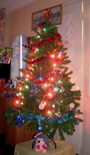 поддавшись всеобщему настроению я нарядила елку... вместо деда мороза, конечно же, новогодний ежик :-))