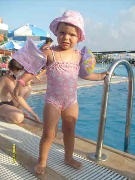 Вам безумно идет белый цвет,шикарные платиЦа.Головные уборы спец. созданы для вас,хде купили повязку с шикарным бантом?Купальник с бегимотиком отпад.Со скольки лет детям одевают нарукавники в бассеин,...?