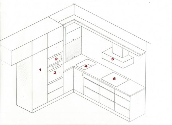 я рисовала это для подруги, но у нее кухня поменьше и ПМ она не хочет, если ПМ нужна, то все это в вашем случае можно сдвинуть вправо от угла 1. холодильник 2. микроволновка 3. духовой шкаф 4. мойка 5. вытяжка 6. варочная поверхность над кухней карниз с бортиком и подсветкой, чтобы спрятать трубу от вытяжки над входной дверью антресоль секция над холодильником и рядом - до потолка слева от раковины за дверцей-жалюзи сушилка для посуды |