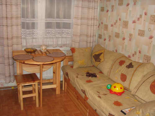 У нас кухня 11м. Идея точно такая же как у Педагога, только у нас стол полукруглый - книжка, диван ракладывается, а стол убираем. И получается большое спальное место, как то даже трое спали