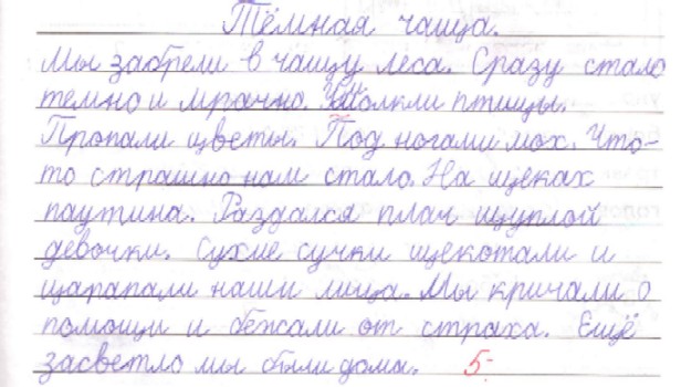 1 "В"Этот текст был написан с первого раза на чистовик, и впервые в жизни на широких линеечках. Таких комплиментов я честно говоря не ожидала, но получать их оказалось очень приятно Вобще дочка у меня очень всё по настроению делает, и очень легко относится к ошибкам и каракулям, они её совершенно не беспокоят. Если бы я показала самые худшие работы, Вы бы точно не назвали её гениальным ребенком. |