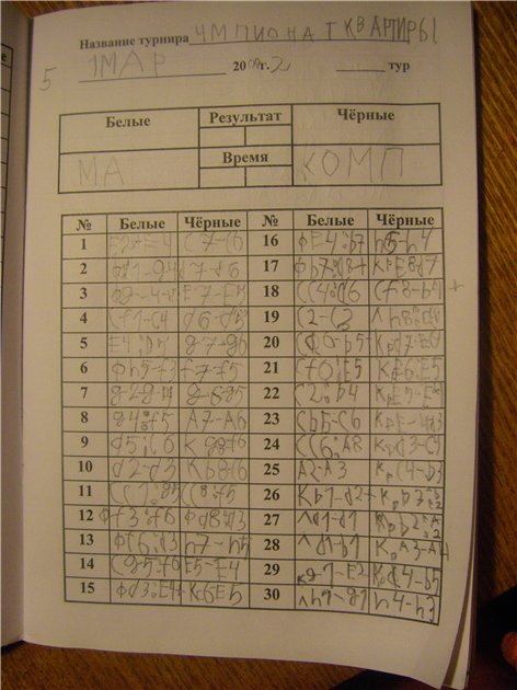 ![]() У вас просто образцово-показательная запись! Завтра выложу наш ![]() ![]() ЗЫ:для экономии сил и времени, можно посоветовать вашему ребенку записывать только на какое поле сделан ход и не писать с какого. Например, не e2-e4, а просто e4 и т.д. |
