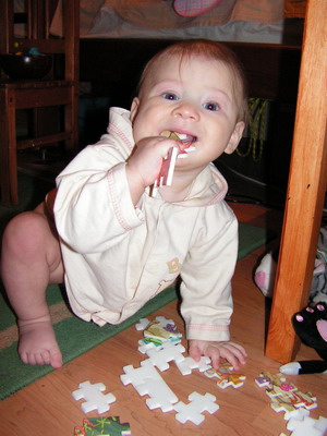 Еще вспомнила - учим водичку в ванной и на кухне. И слово НЕЛЬЗЯ т.к. начали кусать маму и рассыпать кошачий корм, а еще грызть провода, стаскивать с детского столика Маринкины рисунки.....