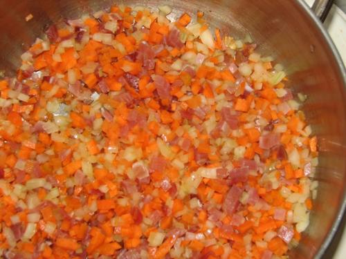 1. Раздавить чеснок в чеснокодавилке или порезать ножом. Налить оливковое масло в большую глубокую кастрюлю, добавить сливочное масло, затем поставить кастрюлю на огонь, помешивать деревянной ложкой 1-2 мин, пока масло не растает. Добавить порезанные овощи (они должны быть порезаны очень мелко, чтобы почти полностью растворится потом во время тушения), чеснок и панчетту и обжаривать 8-10 мин, помешивая, пока овощи не станут мягкими, но не коричневыми.