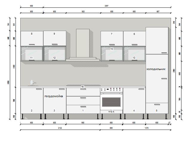 Мойка = 50 см, ПММ = 60 см, ящики = 60 см, духовой шкаф = 60 см, опять ящики 40+60, холодильник = 60 см. микроволновки нет (забыла) над мойкой шкаф для посуду (ее у меня много), а квадратные шкафы не получаются у меня ![]() |