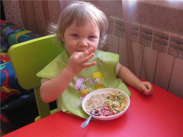 2.Взяли ложку в руки. 3. Наш завтрак сегодня, пшеничная кашка, сосиска, салатик. ![]() 4. Кирюшин "завтрак" ![]() 5. Кирюша совсем большой стал. |