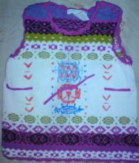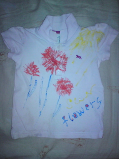 рисовала начистую))) слон был и яблочко тоже было-остальное моя фантазия на жилетку попыталась скопировать вязаный узор-вживую смотрится лучше и сочнее))) а до этого мы просто белые футболки вместе разрисовывали-писали "мама,папа,Янина",солнышко,радугу,всяких животинок рисовали___домики-Янка их дома с огромным удовольствием носит))) |