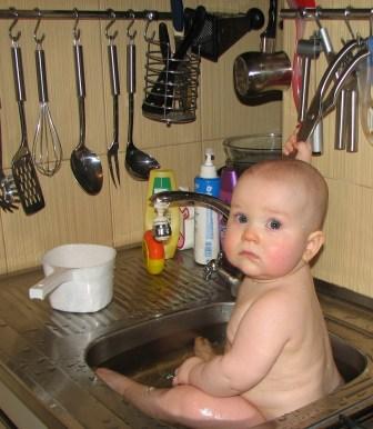 Ага, мы когда ремонтировали ванную туда пять дней дажет заходить нельзя было, А Дани привык мыться кажный день, мы пробывали в ваночке его наполу купать, но он так плескался что я потом потоп всемирные ловила по всей кухни, и на семейном совете было решено - в раковине