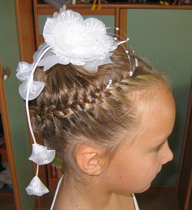 ОЧЕНЬ ХОРОШО ПОЛУЧИЛОСЬмне только кажется, что плести надо потуже и поплотнее немного... Нам тоже очень нравится эта причёска, я ещё делаю такой вариант - на хвост одеваем красивую резинку, с большим цветком например и начинаю плести не сзади по кругу, а спереди в одну сторону и в другую - сзади получается не одна косичка, а две, которые убираю вовнутрь - мне кажется такой варант тоже очень интересен... я уже выкладывала эту фотку, но тут к месту покажу её ещё раз ![]() |